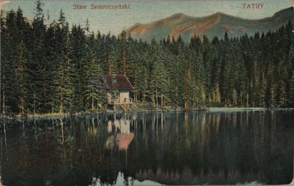 Altana Towarzystwa Tatrzańskiego nad Smreczyńskim Stawem w Dolinie Kościeliskiej. U góry drukowany tytuł.
