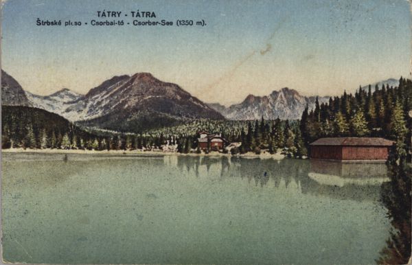 Kąpielisko nad Szczyrbskim Jeziorem. W tle Skrajna Baszta i Wysoka. U góry wydrukowany tytuł, również w języku węgierskim i niemieckim.