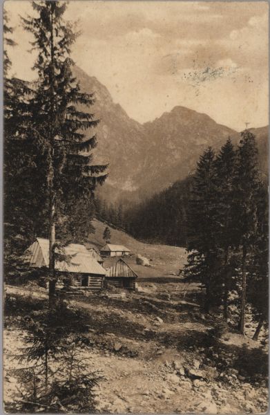 Szałasy na Polanie Strążyskiej.W tle Mały Giewont.