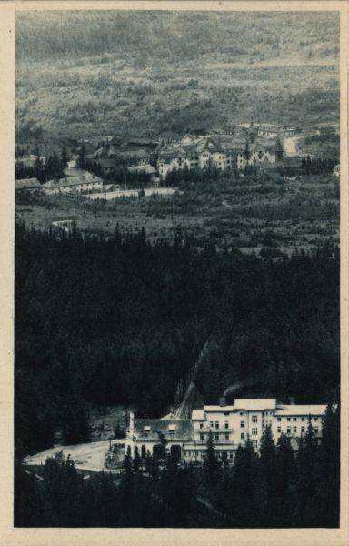 Wysokie Tatry. Hotel Sport Siodełko i Grand Hotel w Starym Smokowcu z Łomnickiej Przełęczy.