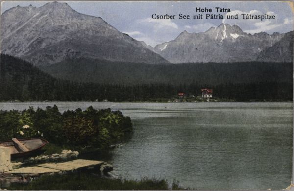Widok znad Szczyrbskiego Jeziora na Skrajną Basztą i Wysoką. Nad brzegiem przystań z łodzią, w tle willa Marina. U góry wydrukowany tytuł, również w języku niemieckim.