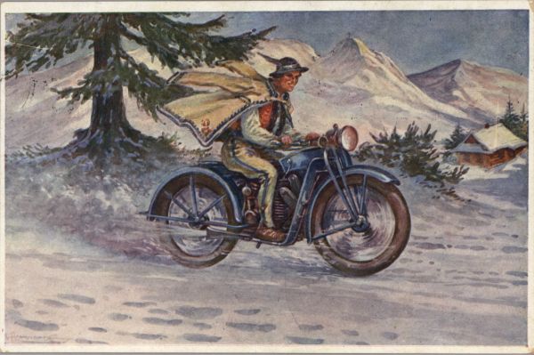 Pocztówka z okazji Nowego Roku. Listonosz góral jedzie na motorze.