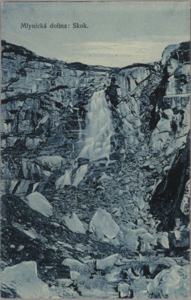 Wodospad Skok w Dolinie Młynickiej. U góry wydrukowany tytuł.