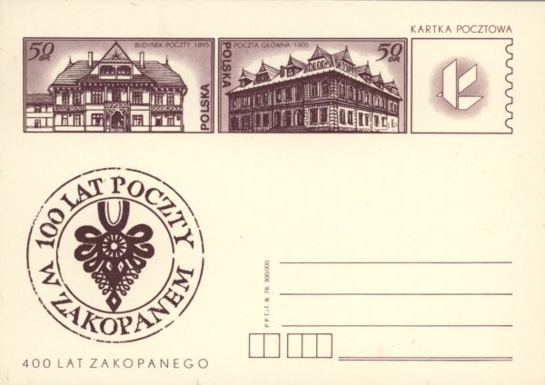 Karta 3. elementowa: Budynek poczty 1895. Poczta główna 1905. 100 lat poczty w Zakopanem.