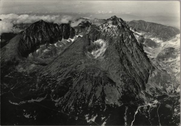 Tatry Wysokie. Widok z samolotu na Gerlach. Z lewej Dolina Batyżowiecka z Batyżowieckim Stawem, z prawej Dolina Wielicka z Wielickim Stawem.