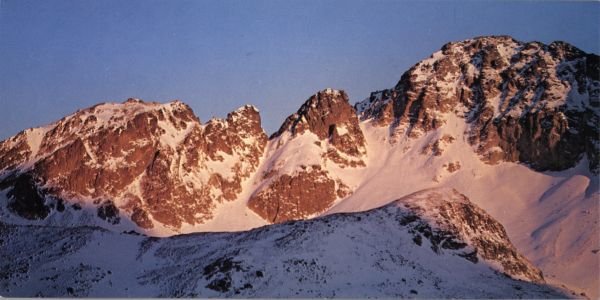 POÉZIA TATIER. VYSOKÉ TATRY - VYSOKIE TATRY - HOHE TATRA - THE HIGH TATRAS. Rovienkova veža, Kresaný roh a Malý Javorový štít od Zbojníckej chaty vo Veľkej Studenej doline.