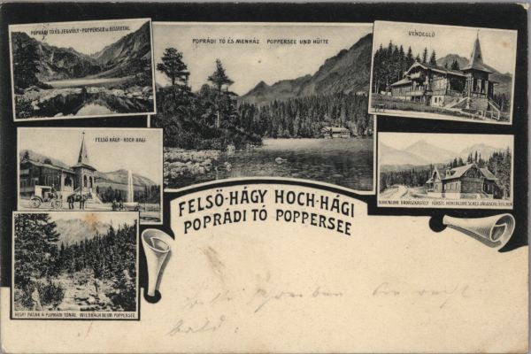 Pocztówka 6. elementowa: Popradzki Staw. Wyżnie Hagi. Dolina Mięguszowiecka. Schronisko nad Popradzkim Stawem. Restauracja. Domek myśliwski Hohenlohego. Pod zdjęciami wpisany tytuł. Korespondencja.