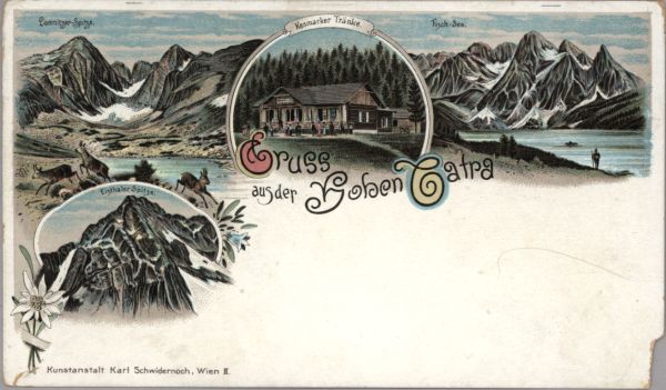 Pocztówka 4. elementowa: Łomnica. Kieżmarskie Żłoby. Morskie Oko. Lodowy Szczyt.