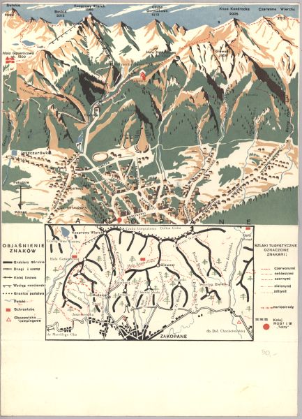 Panoramiczny widok na Tatry od Świnicy po Czerwone Wierchy, od północy. Grzbietowa mapa Tatr. Sieć hydrograficzna. Naniesiona treść turystyczna (szlaki turystyczne, nartostrady, schroniska, obozowiska campingowe). Komunikacja - drogi, kolej linowa, wyciągi narciarskie. Plan Zakopanego.