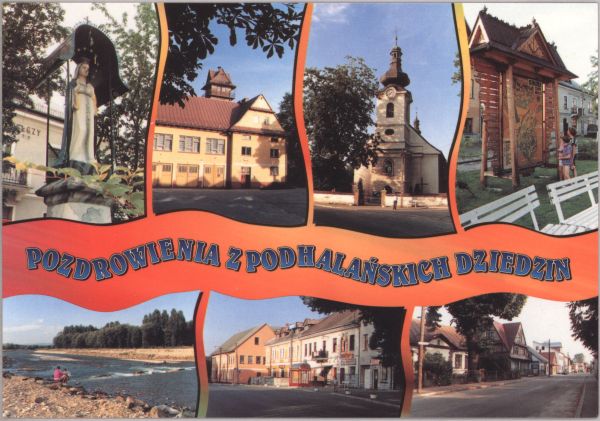 Pozdrowienia z Podhalańskich Dziedzin. Czarny Dunajec. Zabytkowy pomnik na rynku - Remiza OSP, siedziba GOK, - Kościół Parafialny pod wezw. Trójcy Przenajświętszej - Tablica informacyjna okolic Czarnego Dunajca - Fragment plaży - Fragment rynku w Czarnym Dunajcu.
