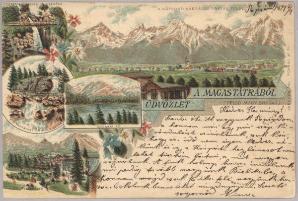 Pocztówka 5. elementowa: Wodospad Olbrzymi. Widok z Popradu na Tatry. Wodospady Zimnej wody. Szczyrbskie Jezioro. Stary Smokowiec. Korespondencja.