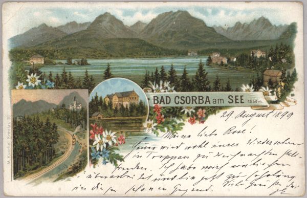 Pocztówka 3. elementowa: Szczyrbskie Jezioro, starsza zabudowa, w tle szczyty otaczające staw. Kolej zębata do Szczyrbskiego Jeziora. Hotel. Korespondencja.