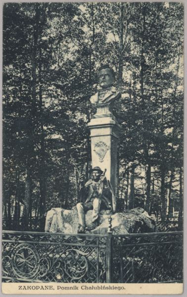 Pomnik Tytusa Chałubińskiego w Zakopanem. Na dole znajduje się postać Jana Krzeptowskiego Sabały. Pod zdjęciem wydrukowany tytuł.
