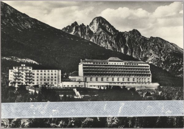 Widok na budynki sanatorium w miejscowości Nowy Smokowiec. W tle po lewej stoki Sławkowskiego Szczytu, po prawej Łomnica.