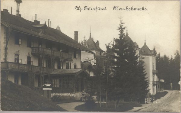 Widok na budynek starego (po lewej) i nowego (w głębi) sanatorium dr Szontagha w Nowym Smokowcu. U góry wpisany tytuł, również w języku niemieckim.
