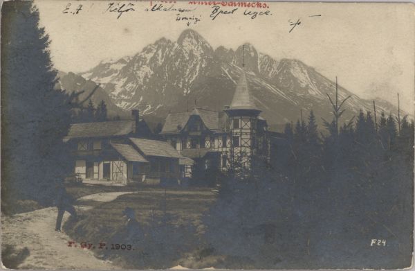 Willa "Migazzi" z dobudowaną wieżą w Dolnym Smokowcu. W tle masyw Łomnicy. U góry odbity pieczątką tytuł, na dole inicjały producenta. Odręcznie wpisane nazwy szczytów.