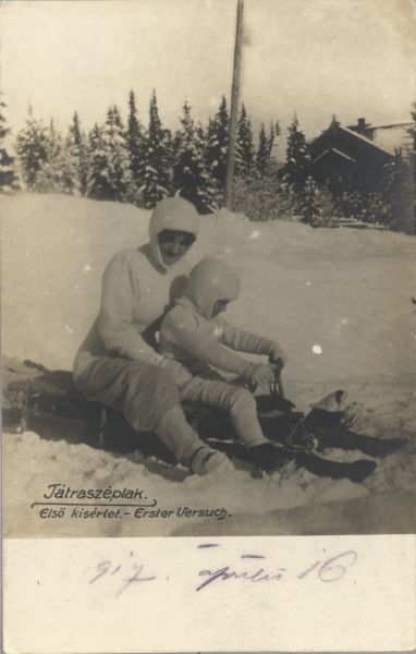 Tatrzańska Polanka w zimowej scenerii. Na pierwszym planie kuracjusze w czasie pierwszej próby jazdy bobslejem. Na dole zdjęcia wpisany tytuł, również w języku niemieckim.