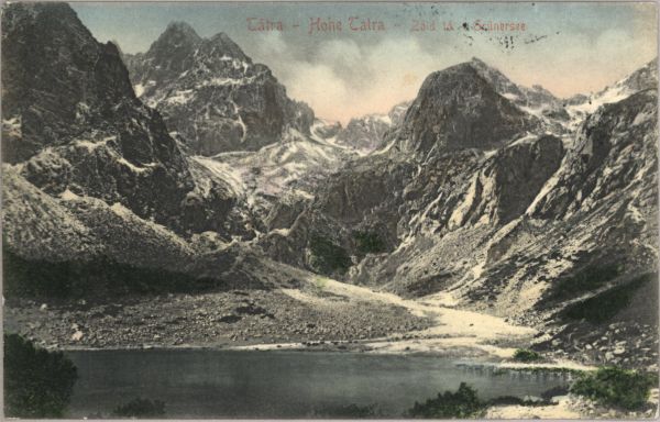Widok na Zielony Staw Kieżmarski i otaczające go szczyty. Od lewej Mały Kieżmarski Szczyt, Łomnica, Durny Szczyt i Czarny Szczyt. U góry wydrukowany tytuł, również w języku niemieckim.
