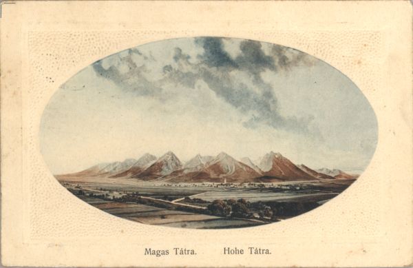 Panorama Tatr Wysokich od południa, znad Popradu. Na dole wydrukowany tytuł, również w języku niemieckim.