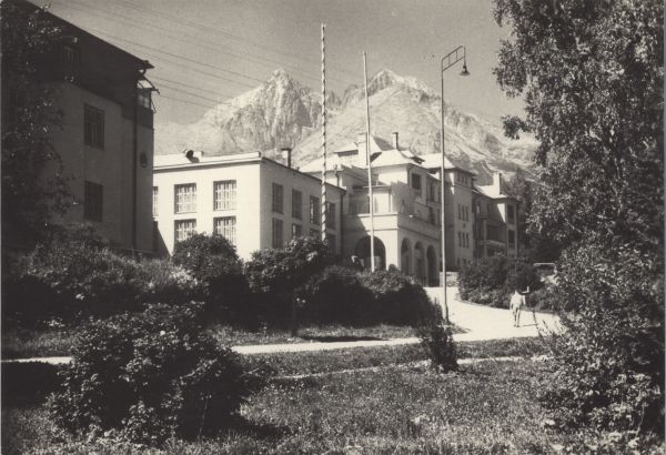 VYSOKÉ TATRY - Tatranské Matliare. Vojenský liečebný ústav. V pozadí Lomnický štít (2634 m) a Kežmarský štít (2558 m).