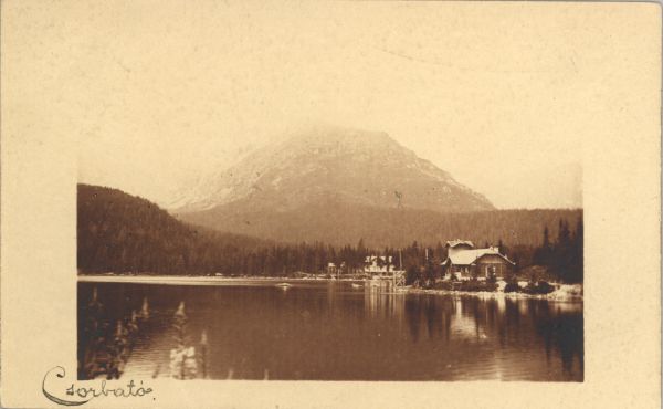 Widok na wschodnią część Szczyrbskiego Jeziora i zabudowania na brzegu. W tle Skrajna Baszta. Pod zdjęciem odręcznie wpisany tytuł.