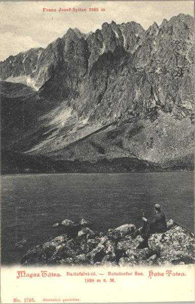 Widok na Batyżowiecki Staw i wznoszący się nad nim masy Gerlacha. Na pierwszym planie turysta. Pod zdjęciem wydrukowany tytuł, również w języku niemieckim, u góry podana nazwa szczytu.