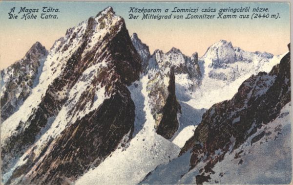 Zimowy widok na Pośrednią Grań z Łomnickiej Przełęczy. U góry wydrukowany tytuł, również w języku niemieckim.