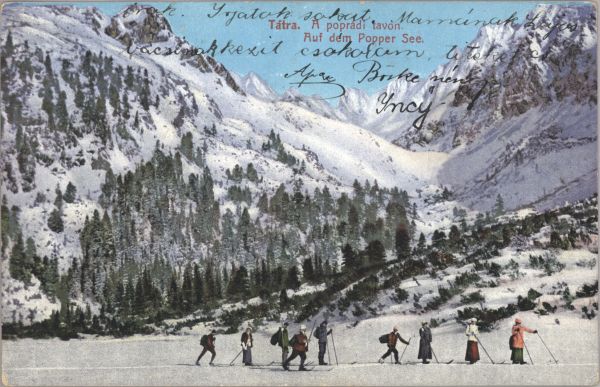 Grupa narciarzy na Popradzkim Stawie. W głębi zaśnieżona Dolina Złomisk. U góry wydrukowany tytuł, również w języku niemieckim.
