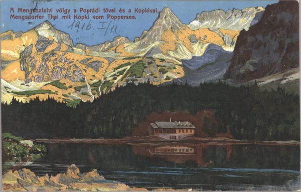 Reprodukcja obrazu Siegfrieda Neumanna przedstawiającego pejzaż z Doliny Mięguszowieckiej. Na pierwszym planie Popradzki Staw i schronisko turystyczne. W tle Koprowy Wierch i Wołowiec Mięguszowiecki. Praca sygnowana przez autora: SN 25. U góry wydrukowany tytuł, również w języku niemieckim.