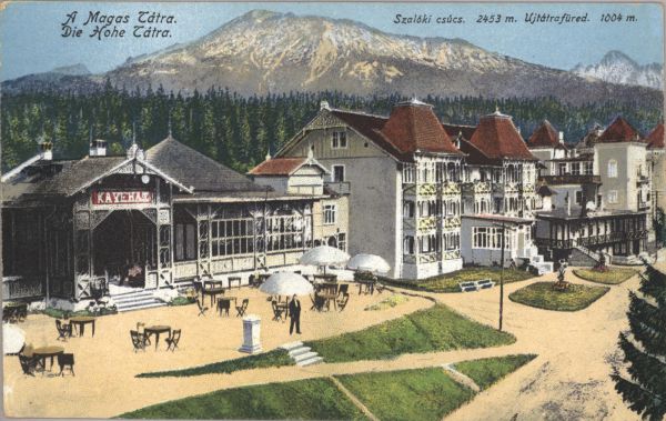 Nowy Smokowiec. Po lewej stronie wybudowana w 1895 r. kawiarnia, w głębi sanatoria. W tle Sławkowski Szczyt. U góry wydrukowany tytuł, również w języku niemieckim.