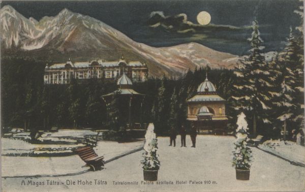 Reprodukcja obrazu przedstawiającego Grand Hotel w Tatrzańskiej Łomnicy w zimowej scenerii nocą. W tle Łomnica i Kieżmarski Szczyt. Na dole wydrukowany tytuł, również w języku niemieckim.