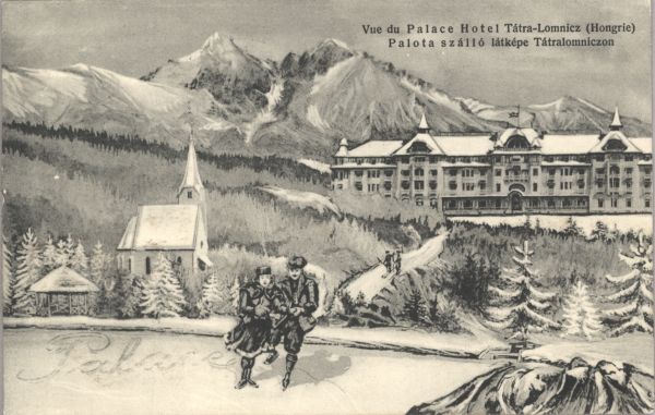 Pocztówka reklamująca Grand Hotel w Tatrzańskiej Łomnicy w zimowej scenerii. Na pierwszym planie para łyżwiarzy na lodowisku. W tle Łomnica i Kieżmarski Szczyt. U góry wydrukowany tytuł, również w języku węgierskim.