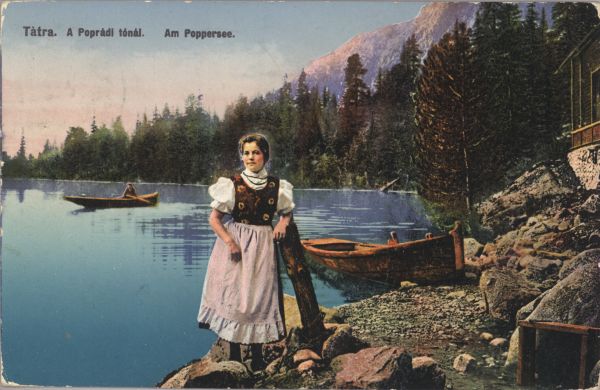 Popradzki Staw. Przystań łódek dla gości przy schronisku Majlátha. Na pierwszym planie kobieta w stroju ludowym. U góry wydrukowany tytuł, również w języku niemieckim.