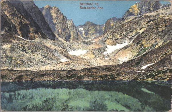 Widok na Batyżowiecki Staw i szczyty otaczające Dolinę Batyżowiecką. Od lewej Grań Kończystej, Zmarzły Szczyt (w głębi), Kaczy Szczyt i Batyżowiecki Szczyt. U góry wydrukowany tytuł, również w języku niemieckim.