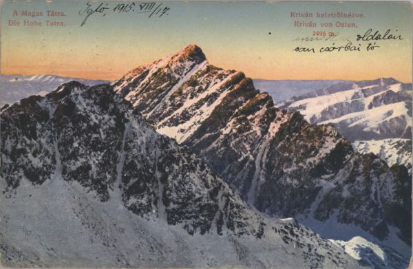 Szczyt Krywania od wschodu w zimowej scenerii. Na pierwszym planie Krótka. U góry wydrukowany tytuł, również w języku niemieckim. Odręcznie wpisana data: 1915. VIII/17.