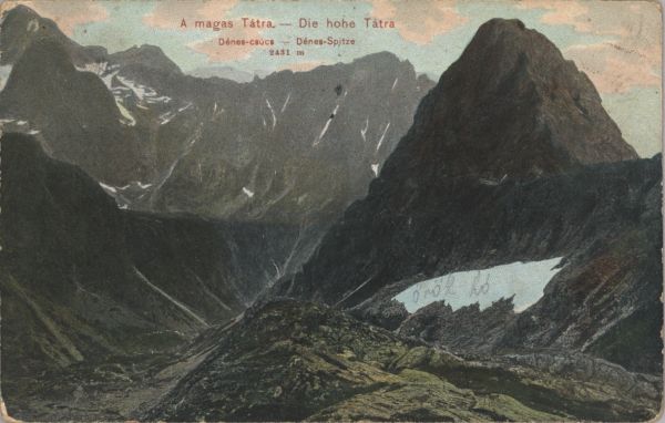 Widok na Hrubą Turnię z rejonu Litworowej Prehyby. Po lewej stronie Dolina Litworowa przechodząca w Dolinę Białej Wody, powyżej Dolina Ciężka i otaczające ją szczyty. Najwyższy szczyt po lewej stronie to Niżnie Rysy, po prawej Młynarz. U góry wydrukowany tytuł, również w języku niemieckim.