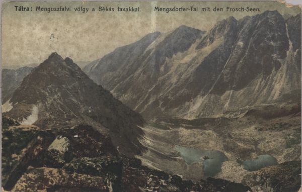 Widok na Dolinę Żabią Mięguszowiecka i Żabie Stawy. Po prawej Kopa Popradzka, w głębi grań Baszt. U góry wydrukowany tytuł, również w języku niemieckim.