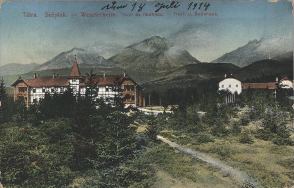 Tatrzańska Polanka. Widok na willę Tivoli (po lewej) i Dom Zdrojowy. W tle Gerlach. U góry wydrukowany tytuł, również w języku niemieckim. Odręcznie wpisana data: 18 Juli 1914.
