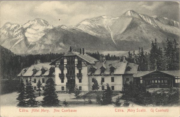 Widok na Hotel Móry w Nowym Szczyrbskim Jeziorze wybudowany w 1905 r., który dał początek nowej osadzie. W tle okoliczne szczyty, od lewej Kopa Popradzka, Wysoka, Osterwa i Kończysta. Pod zdjęciem wydrukowany tytuł, również w języku niemieckim.