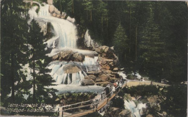 Widok na Wielki Wodospad w Dolinie Zimnej Wody w Tatrach Wysokich. Na pierwszym planie mostek, na którym stoi grupa turystów. Na dole wpisany tytuł, również w języku niemieckim.