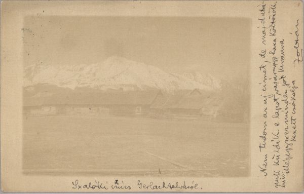 Zimowy widok na Sławkowski Szczyt z miejscowości Gierlachów. Na pierwszym planie zabudowa osady. Pod zdjęciem opis widoku w języku węgierskim, na marginesie korespondencja.