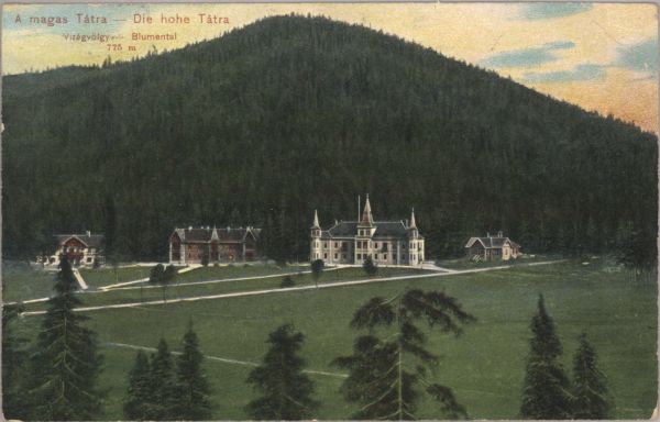 Widok na zabudowania sanatoryjne w osadzie Kwietnica, obecnie dzielnicy Popradu. U góry wydrukowany tytuł, również w języku niemieckim.