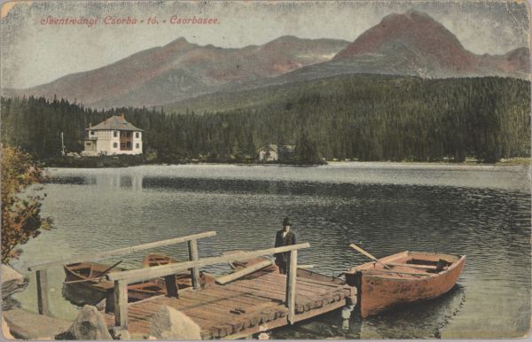 Przystań dla łódek, którymi turyści pływali po Szczyrbskim Jeziorze od lat 80. XIX wieku. Na brzegu willa Tivoli. W tle szczyty: Krywań, Ostra i Solisko. U góry wydrukowany tytuł, również w języku niemieckim.