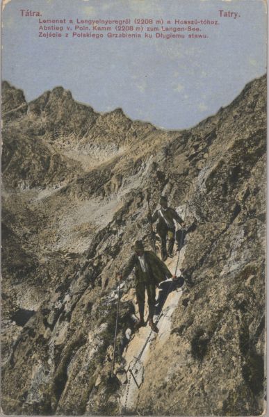 Dwaj turyści w strojach z epoki na ścieżce turystycznej prowadzącej z Polskiego Grzebienia nad Długi Staw w Dolinie Wielickiej. W tle o lewej Litworowy Szczyt i Wielicki Szczyt. U góry drukowany tytuł, również w języku niemieckim i polskim.