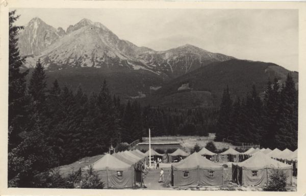 Obozowisko w Tatrzańskich Matlarach. W tle Łomnica, Kieżmarski Szczyt i Huncowski Szczyt.