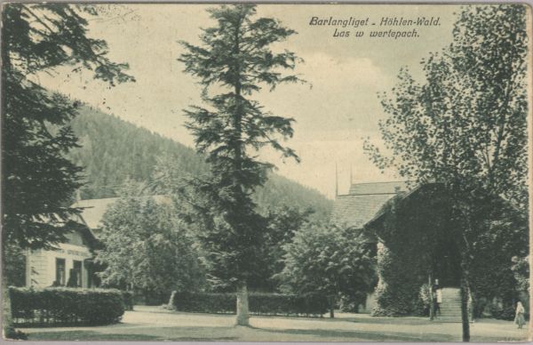 Widok na zabudowania Tatrzańskiej Kotliny. U góry wydrukowany tytuł, również w języku niemieckim i polskim. W języku polskim podano tytuł: "Las w wertepach".