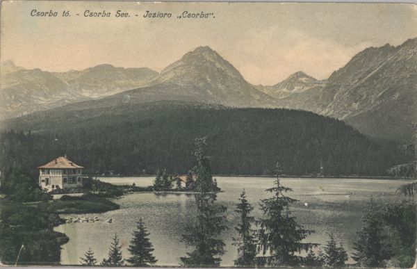 Widok na Szczyrbskie Jezioro i otaczaj±ce je szczyty. Od lewej Krywań, Ostra, Wielkie Solisko, Szczyrbski Szczyt i Grań Baszt. Nad jeziorem willa "Tivoli". U góry wydrukowany tytuł, również w języku niemieckim i polskim.