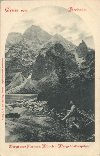 Widok ma Morskie Oko i otaczające go szczyty. Od lewej Mięguszowiecki Szczyt Wielki, Cubryna i Mnich. Na pierwszym planie na głazie siedzi przewodnik Klemens Bachleda. Nad i pod zdjęciem wydrukowany tytuł, na marginesie nazwa wydawcy.