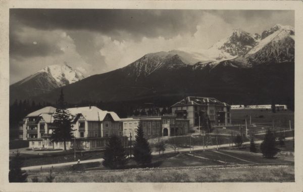 Tatrzańskie Matlary. Zabudowania hotelowo sanatoryjne. W tle zaśnieżone: Sławkowski Szczyt i Łomnica.