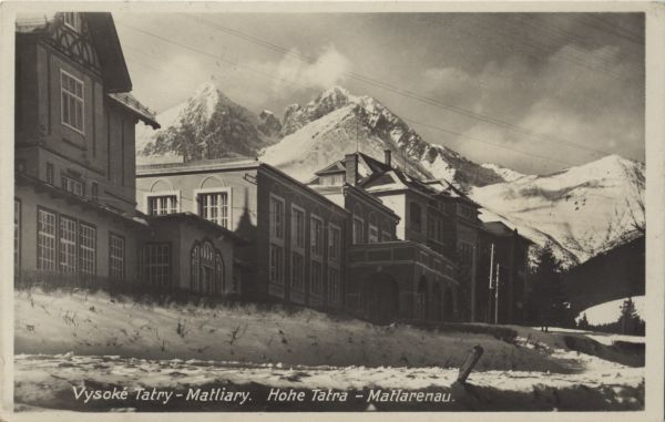 Tatrzańskie Matlary. Budynek hotelu i sanatorium w zimowej scenerii. W tle Łomnica i Kieżmarski Szczyt. Na dole wpisany tytuł, również w języku niemieckim.